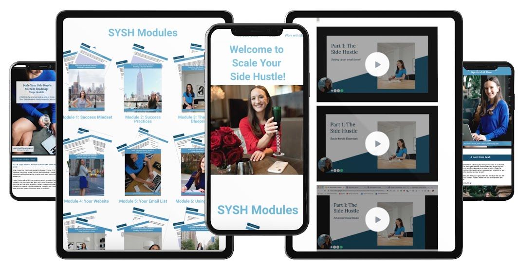 ($250 value)- Take a behind-the-scenes look at one of SYSH's most successful alumni. This student went into SYSH with no business, no website and selling nothing, and three months later was already making thousands per month from her side hustle. She made a step-by-step guide of what she did each week to stay focused and achieve such results.